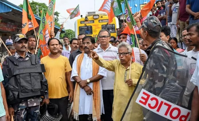 Alipurduar: A scuffle broke out between BJP activists and police as they attempted to block a major road. Protestors chanted slogans demanding the chief minister’s resignation.